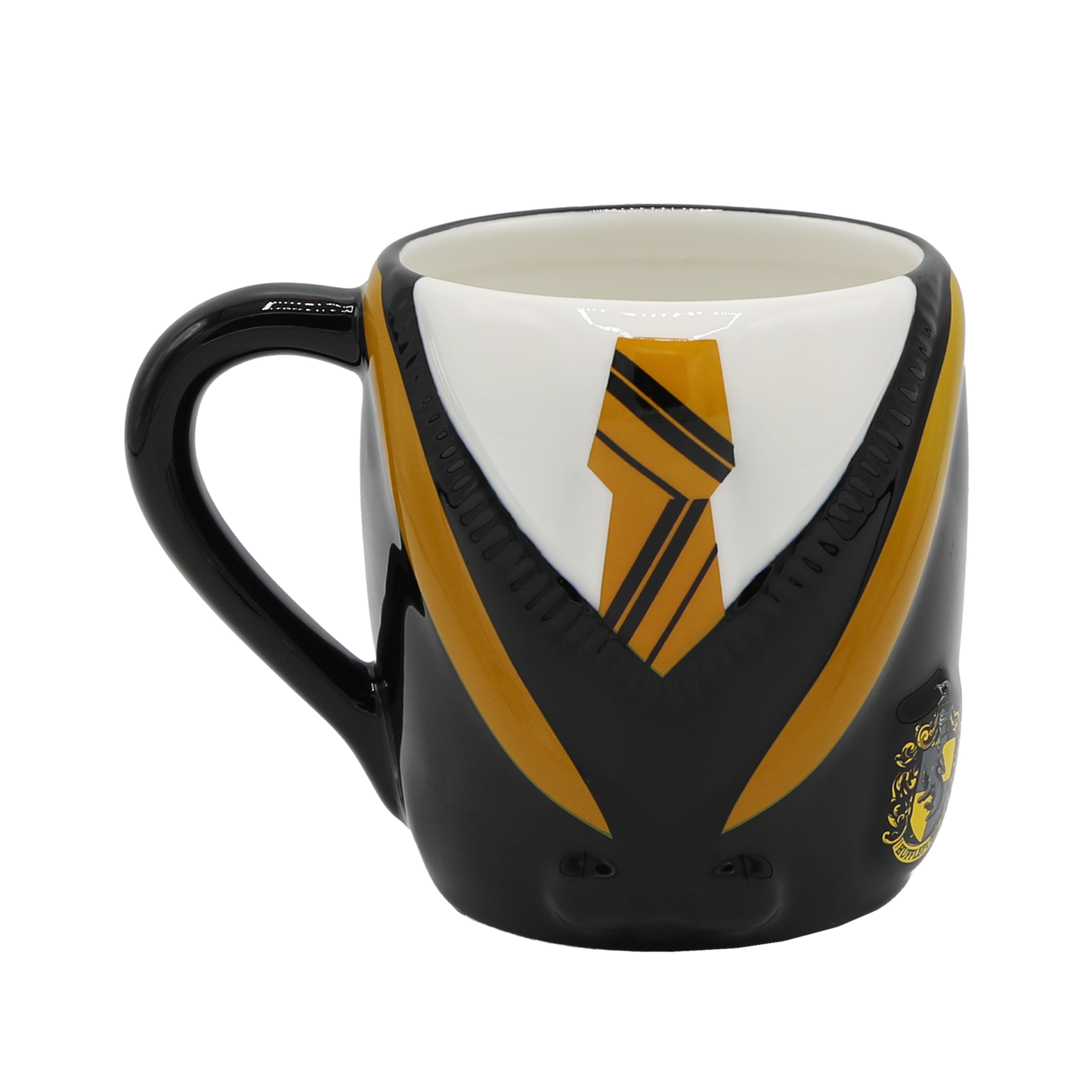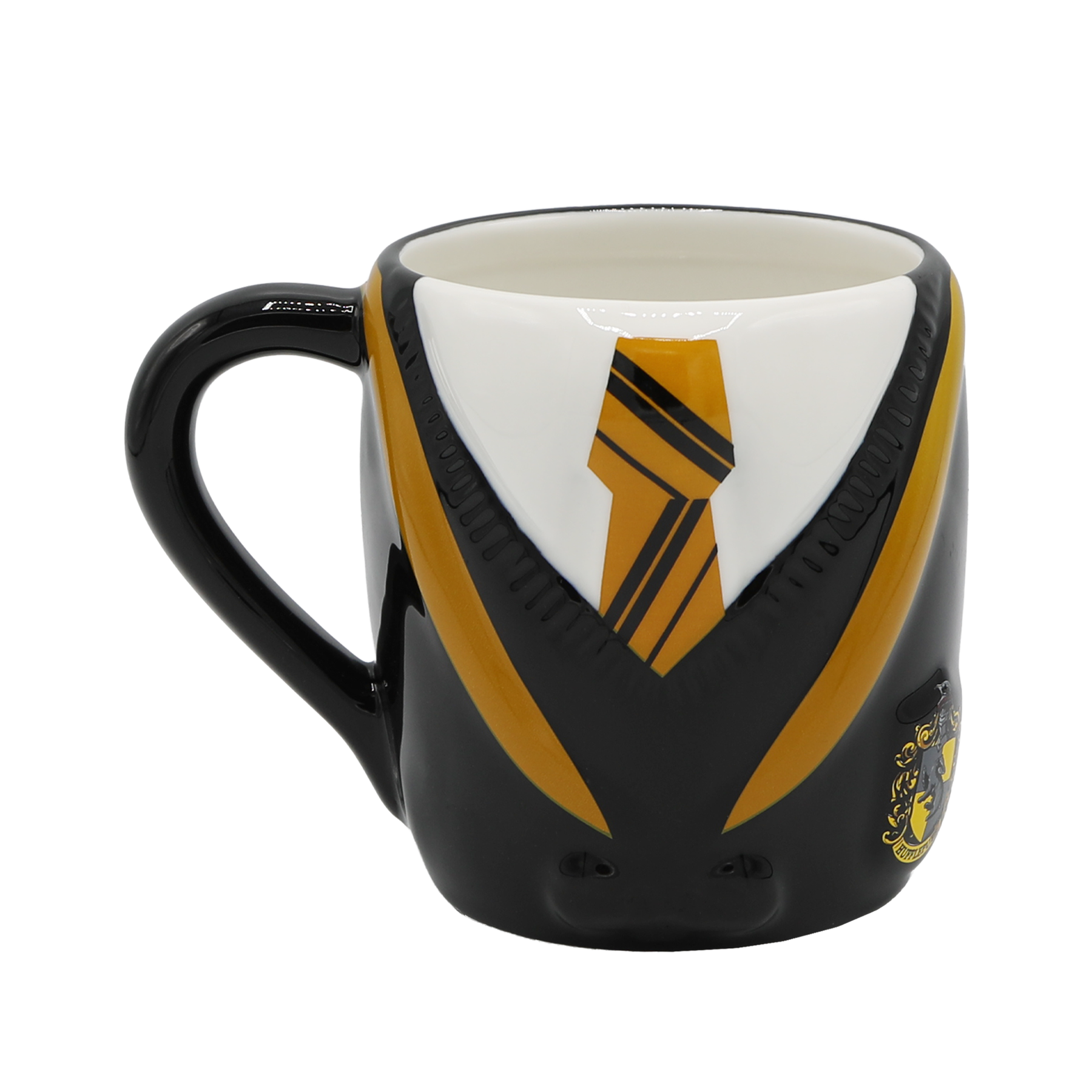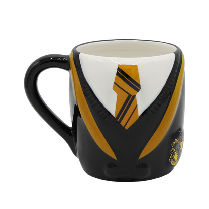 Crafted from durable ceramic, this mug is styled to resemble the iconic Hufflepuff house uniform, complete with a crisp white shirt collar, yellow and black striped tie, and a black robe with yellow trim. The reverse side features a bright yellow hood detail, while the front proudly displays the Hufflepuff crest—symbolising loyalty, patience, and dedication. With a sleek black handle and a white interior, it’s perfect for sipping your favourite hot drink while studying for your O.W.L.s or relaxing in the common room.