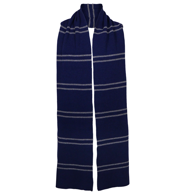 マフラーはレイブンクローを象徴するネイビーブルーとシルバーグレーの配色で、サイズは長さ 約220cm × 幅 約20cm。