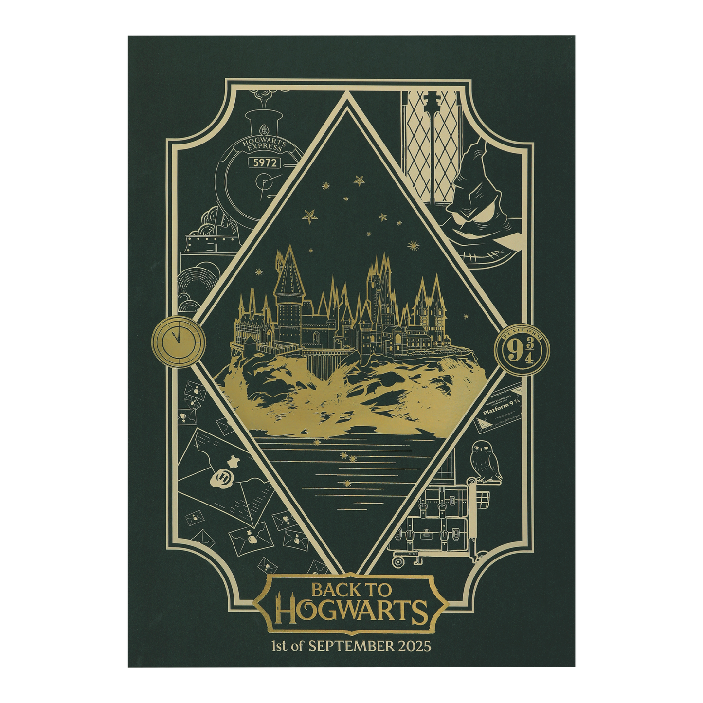 左上にはホグワーツ特急が蒸気船のように進入し、右下にはヘドウィグが佇んでいます。中央には金箔で飾られたホグワーツ城が堂々と鎮座し、その両脇には9と3/4番線の標識と、出発時刻に合わせて11時で止まった時計が配置されています。台座には「Back to Hogwarts」のロゴが光り、2025年限定の「組分け帽子」と「宙に浮く合格通知」が、今年の魔法の帰還を象徴しています。
