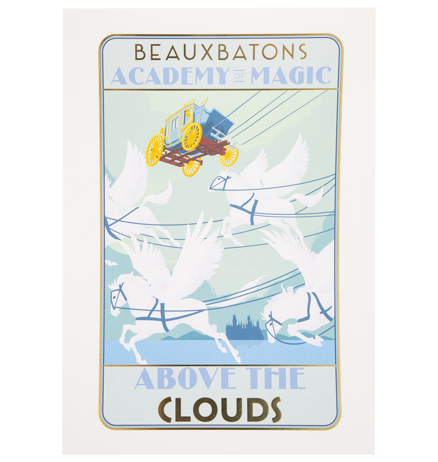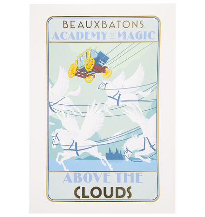 プリントの下部には「雲の上」というフレーズが浮かび、この学校の幻想的な魅力を想起させます。壁掛けアートとして、あるいは記念品として飾っても、このプリントはどんな空間にも魔法使いの優雅さを添えます。ボーバトンの魔法に浸り、この素晴らしいプリントがあなたの想像力を新たな高みへと誘います。