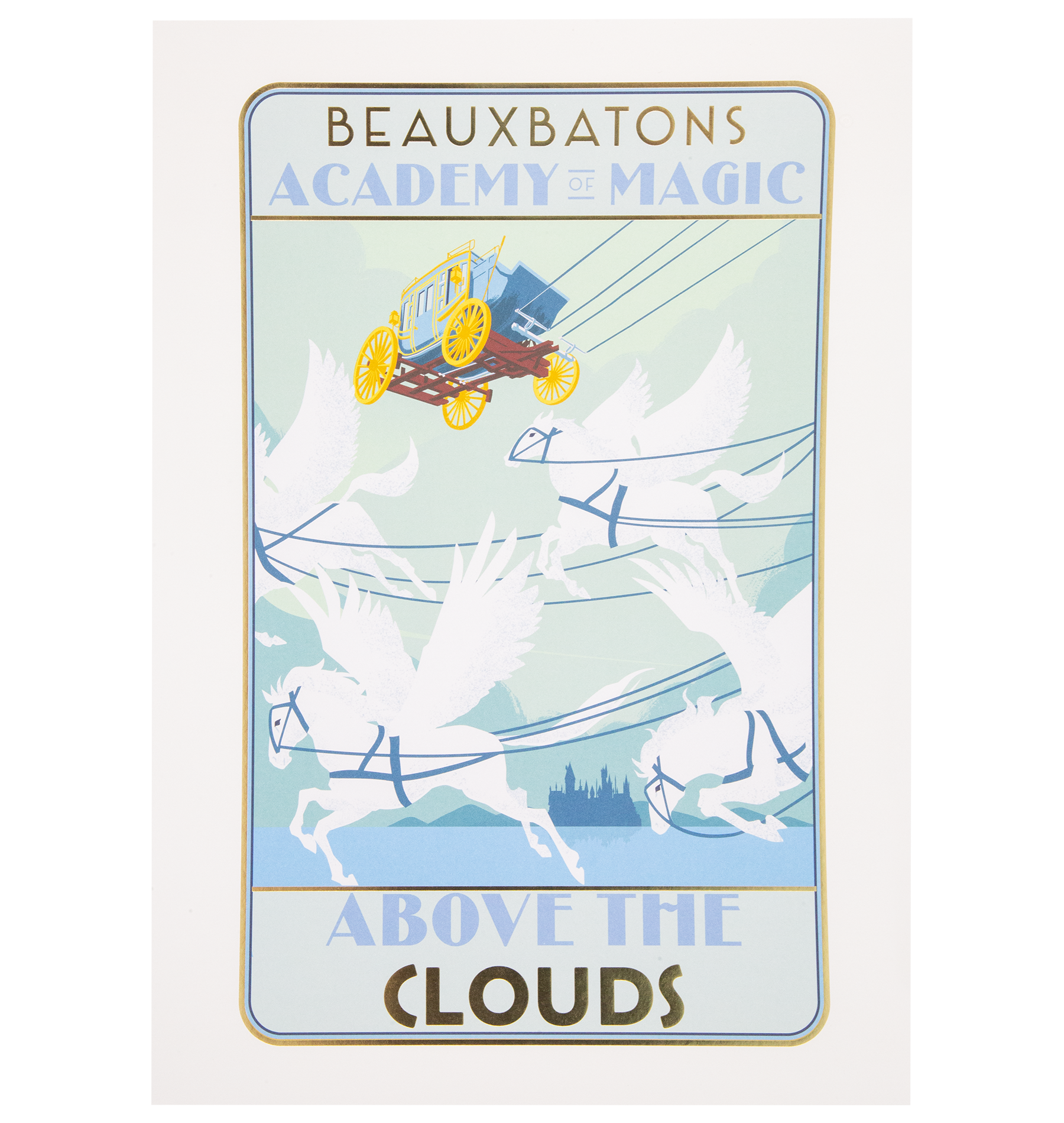 魅惑的なA3サイズのプリントで、ボーバトンの魅惑的な世界へお連れください。青、緑、白の調和のとれた色合いに、きらめく金箔がアクセントとなり、荘厳なボーバトンの馬車と優雅な馬たちを精巧に描き出しています。