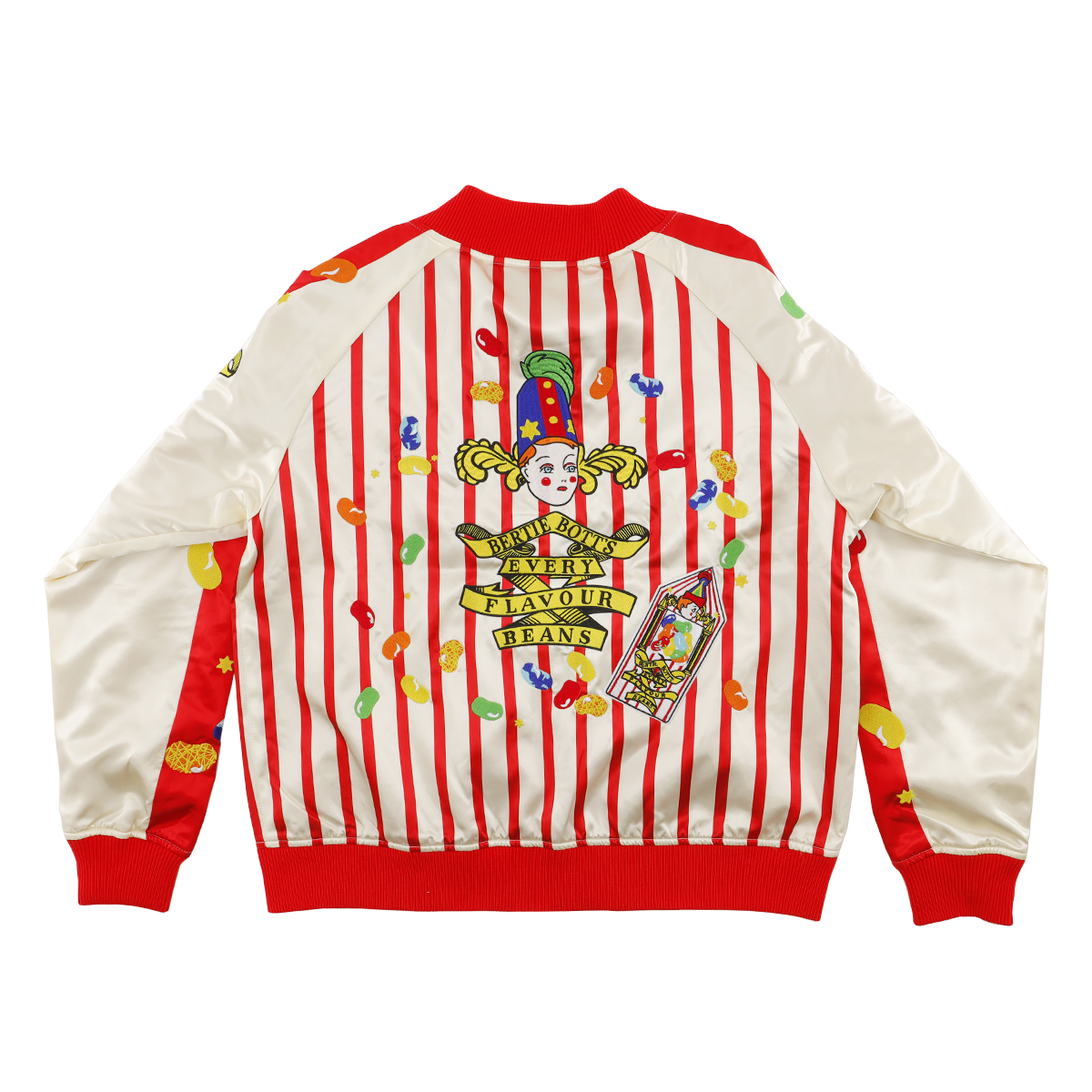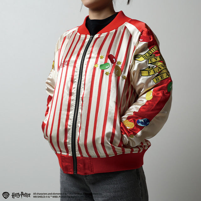 バーティーボッツの百味ビーンズの世界観を大胆にデザインした、ポップで遊び心あふれるボンバージャケット。 赤とホワイトのストライプに、カラフルなビーンズを散りばめたデザインは、まるでホグズミードの店先に立っているかのような気分にさせてくれます。 背面に...詳細を表示する