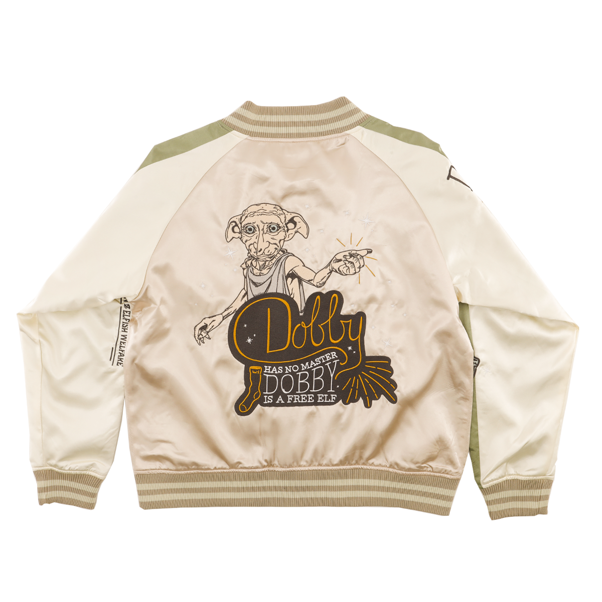 背面には、杖を掲げるドビーのアートワークと「DOBBY HAS NO MASTER. DOBBY IS A FREE ELF.」のメッセージ。