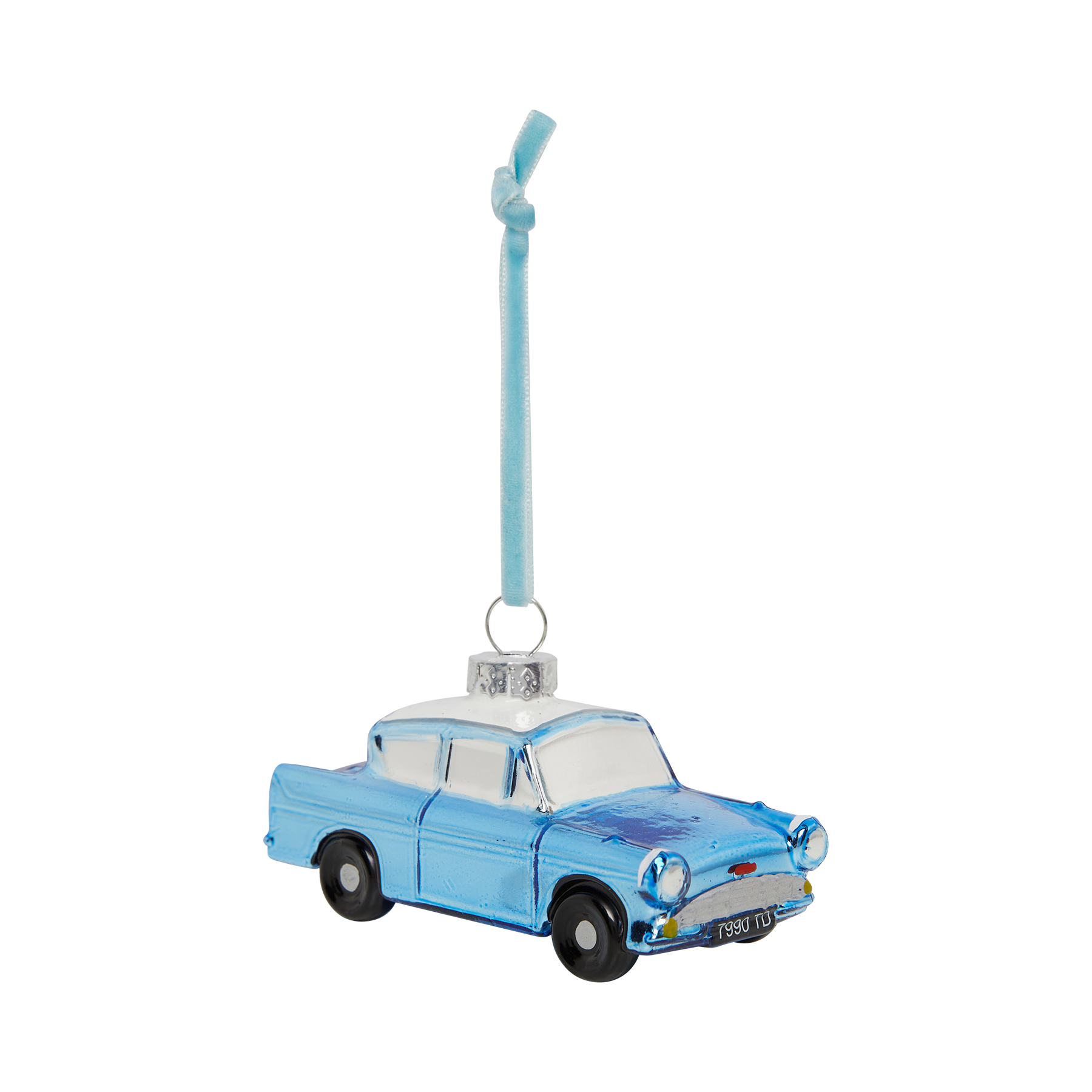 ウィーズリー家の魔法の車をモチーフにしたフォード・アングリア ガラス オーナメント。クリスマスツリーに遊び心を加えるユニークなアイテムです。