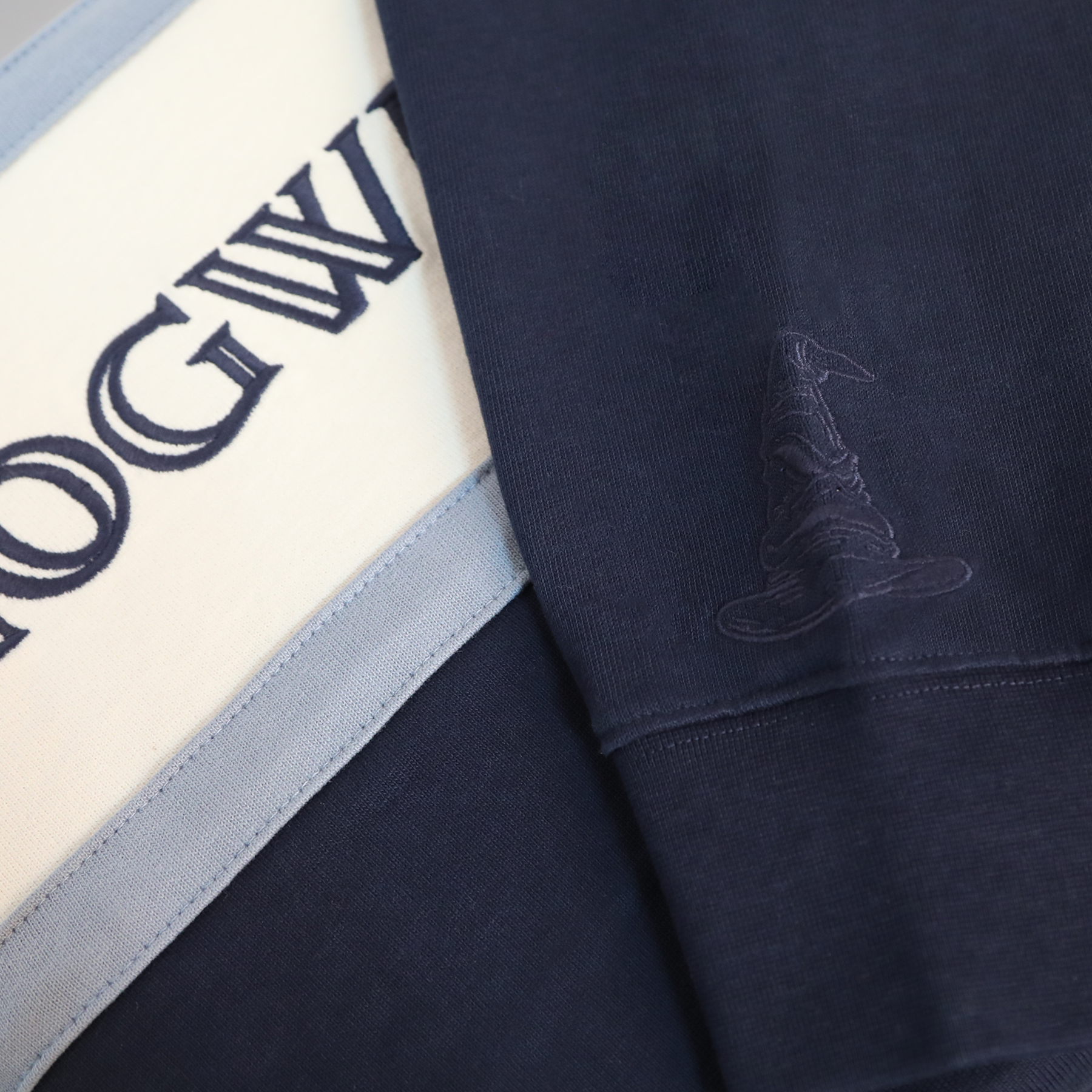 ホグワーツ クレスト コレクションを象徴するブルーの配色が、冬らしく洗練された印象を演出。胸元には存在感のある「Hogwarts」のアップリケロゴを大胆に配置し、ひと目で伝わるスクールプライドを表現しています。