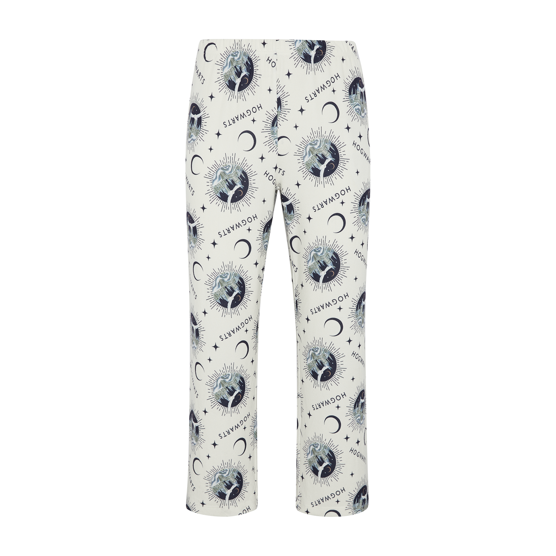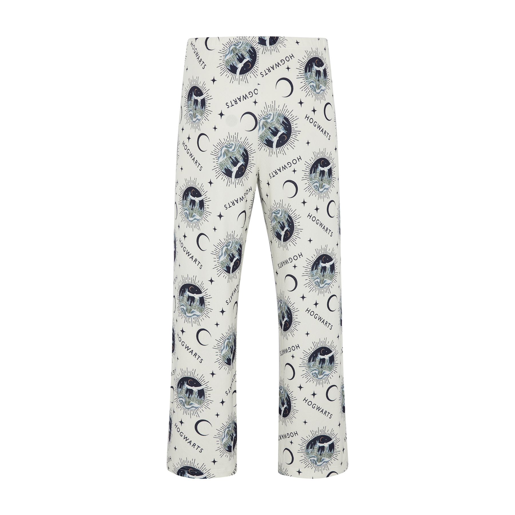 ゆったりとしたシルエットのパーカーには、雪に包まれたホグワーツ城とその上を舞うヘドウィグの幻想的なデザインが描かれ、まるで星を頂いたクリスマスツリーのよう。ワイドレッグのパンツには、同じモチーフに加え、月や星、そしてホグワーツの文字が散りばめられた総柄プリントを採用しています。