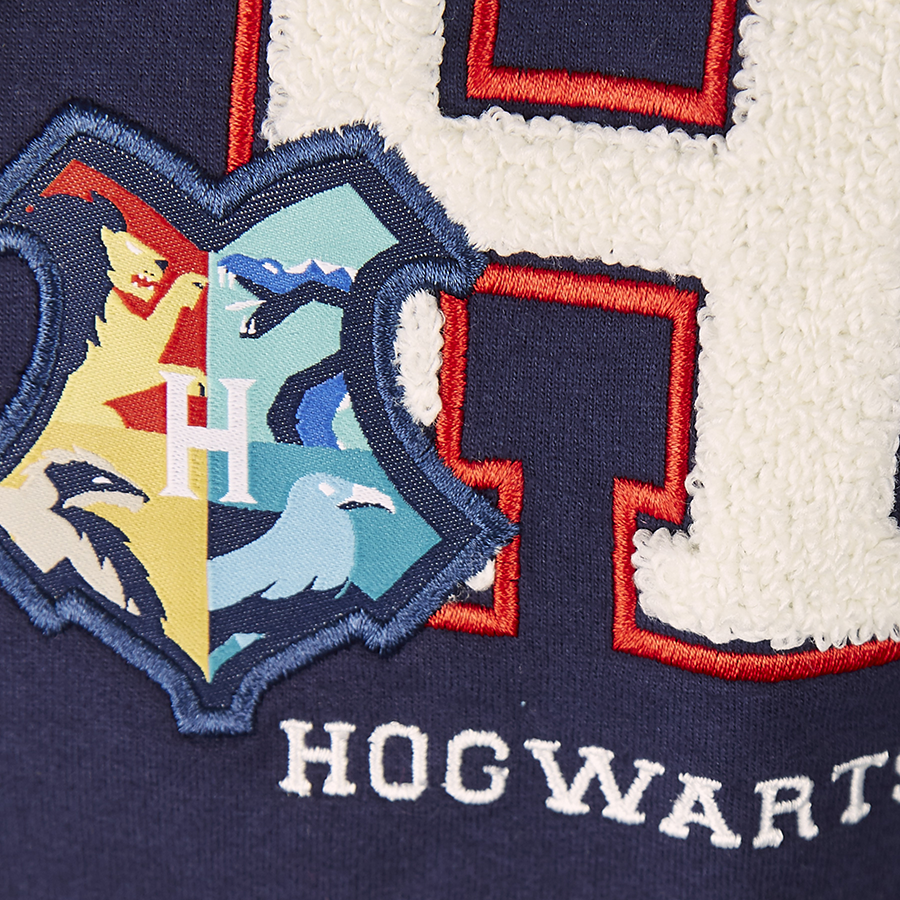 ホグワーツ ジップ付き パーカーで小さな魔女、魔法使いのホグワーツ入学の準備をしましょう!このネイビーのパーカーはクラシックなホグワーツスタイルのデザインで、裾と袖口には2本の白のストライプをあしらいスポーティーに仕上げられています。目立った特徴は左胸に代表チーム文字である『H』のワッペンをふわふわとしたデザインで仕上げており、その下に『Hogwarts』の文字を刺繍しました。その右にはカラフルなホグワーツのエンブレムをそれぞれの寮のマスコットを際立たせて描かれています。
