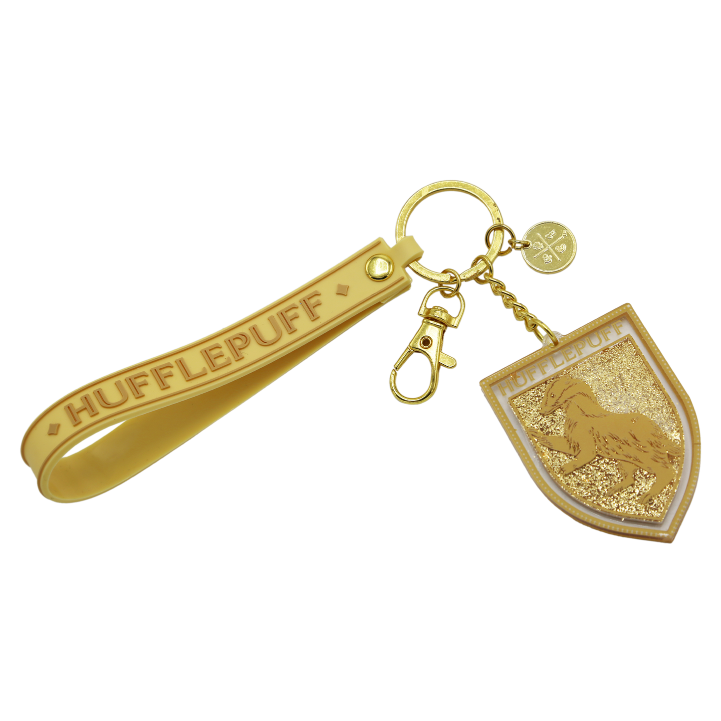 幅 6cm、高さ 4.5cm の盾型のチャームには、寮名の下にハッフルパフのアナグマの限定ハウスマスコット コレクション デザインが誇らしげに描かれています。柔らかいラバー ストラップに付いている「Hufflepuff」の文字は、バニラ クリーム色のカリグラフィー フォントでエレガントにプリントされています。ゴールド トーンの金具には、安全な留め具と、公式ロゴの十字架があしらわれたハリー・ポッター ショップ トークン チャームが付いています。