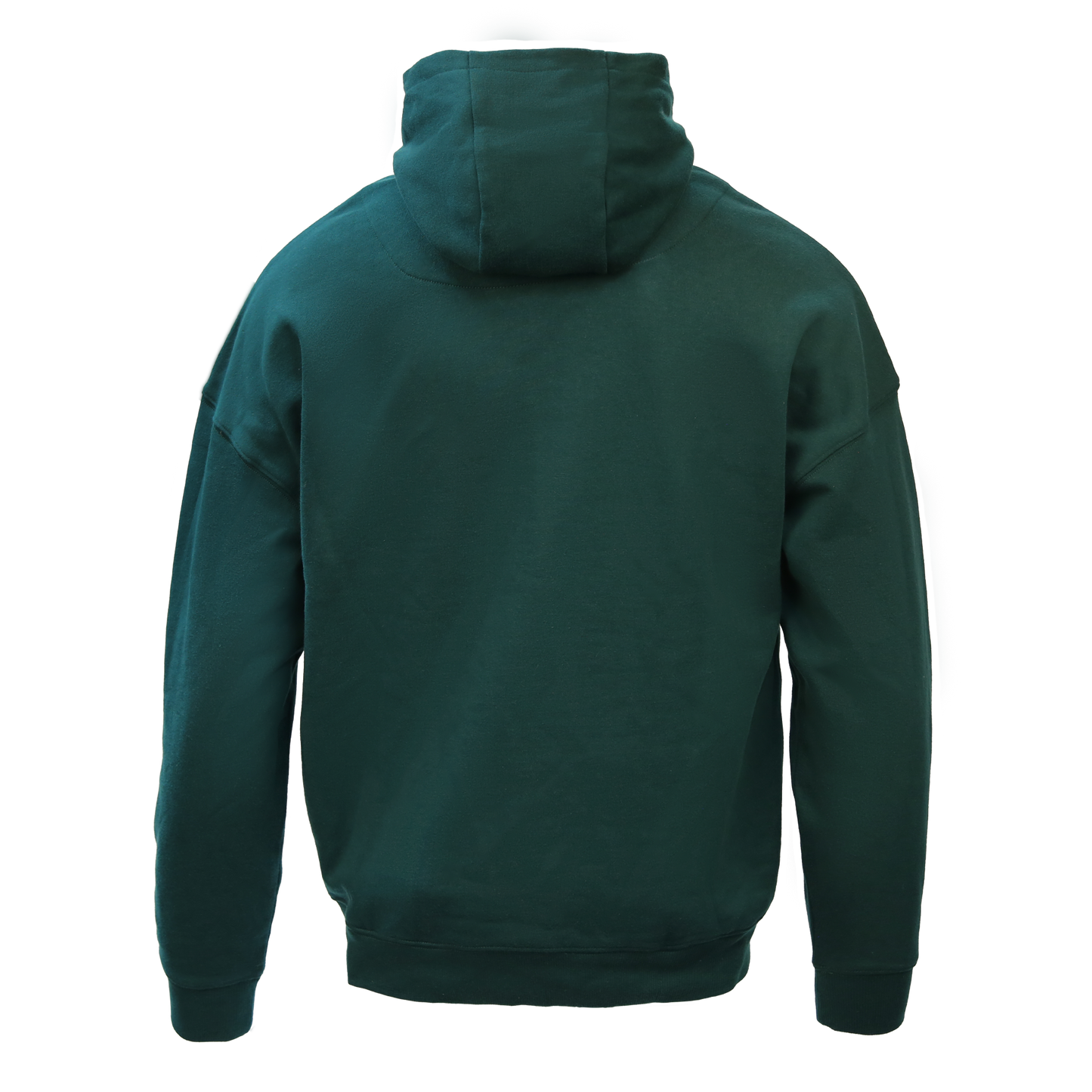 ダークグリーンのつる植物の刺繍が胸と右袖にさりげなく織り込まれ、控えめながらも力強い質感を生み出しています。フロントのカンガルーポケットに控えめに付いたタブは、この寮の特徴を上品に表現しています。