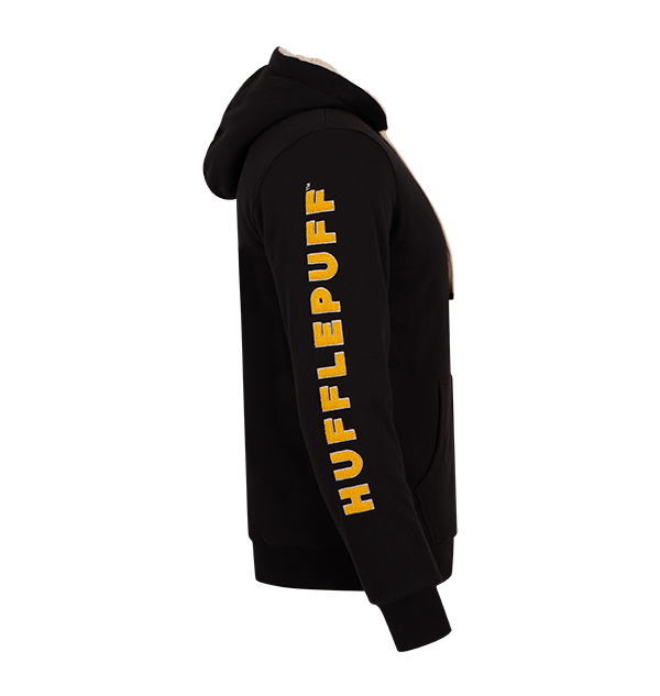 寒い季節にぴったりな、ハッフルパフ寮のフリースパーカー。シックなブラックのボディに、胸元には忠誠心を象徴する黄色のアナグマの刺繍をあしらい、袖にはイエローフォントで「Hufflepuff」の寮名をプリント。さらに背後には寮のモットー 「忍耐」「献身」「忠誠」 が刻まれ、ハッフルパフの精神を日常にまとえます。