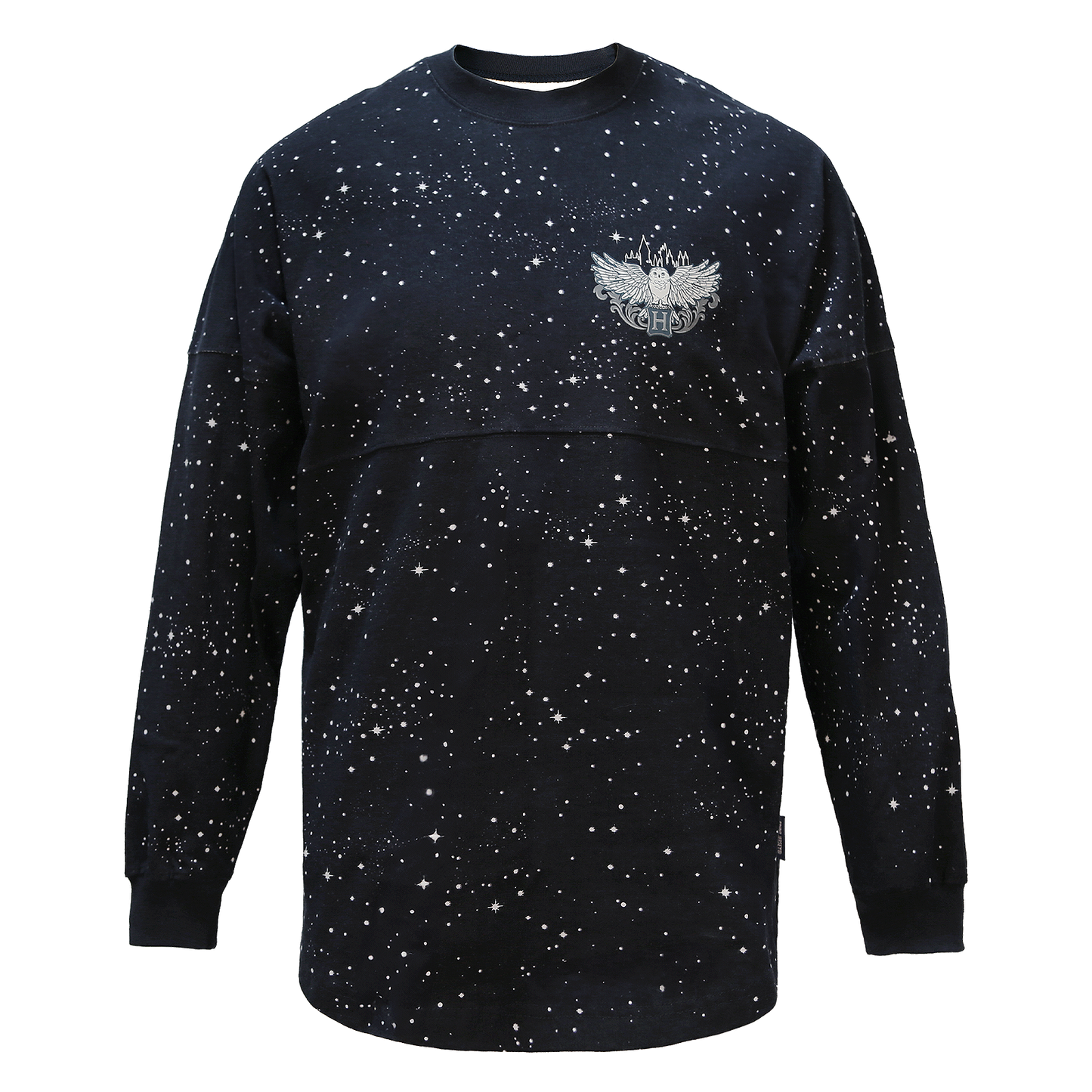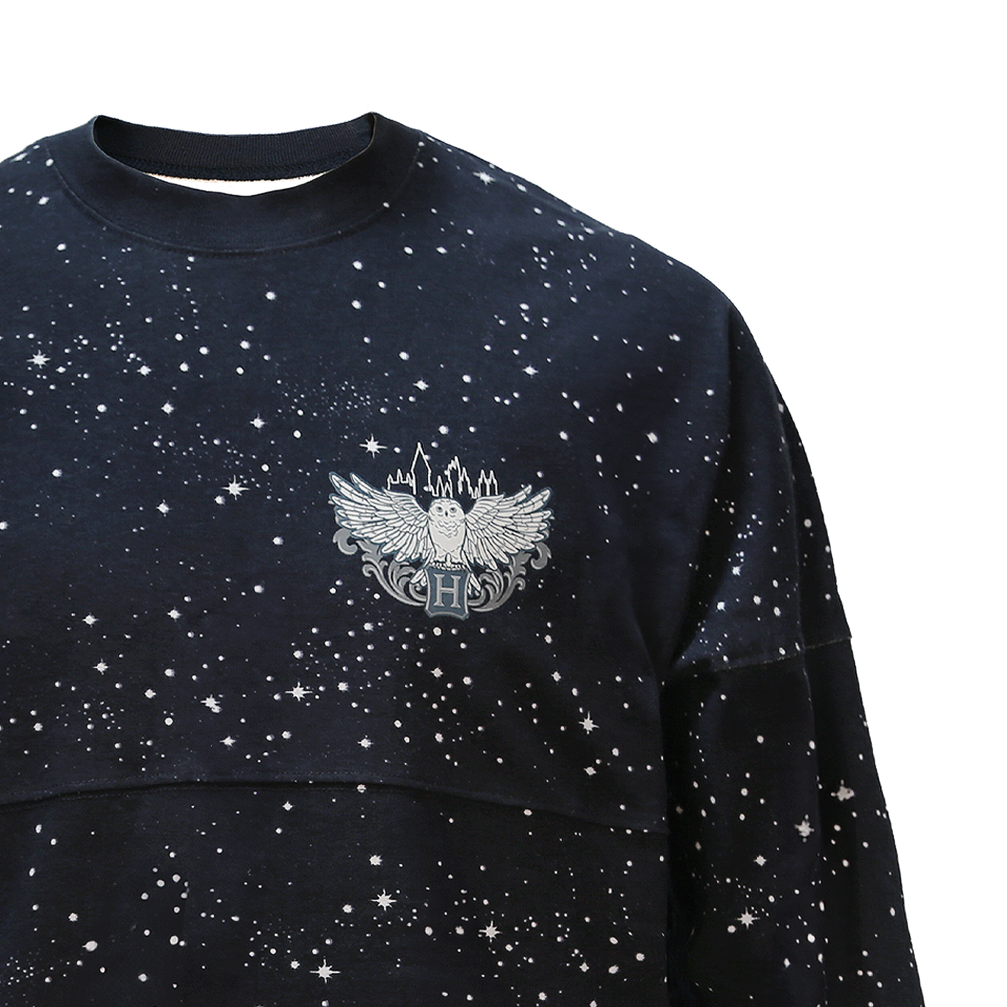 マジカル ホグワーツのスピリット ジャージーで魔法に身を包みましょう。マジカルホグワーツコレクションだけの限定品です。この濃紺のオーバーサイズのスウェットシャツには、銀色の星がきらめいています。背中の肩には、大胆なパフインクで「ホグワーツ」の文字が誇らしげに描かれ、前面の左胸には、美しいアートワークが施されています。鮮やかな白のヘドウィグが、奥のホグワーツ城のシルエットの上に優雅に翼を広げ、エレガントな銀の細工で縁取られています。