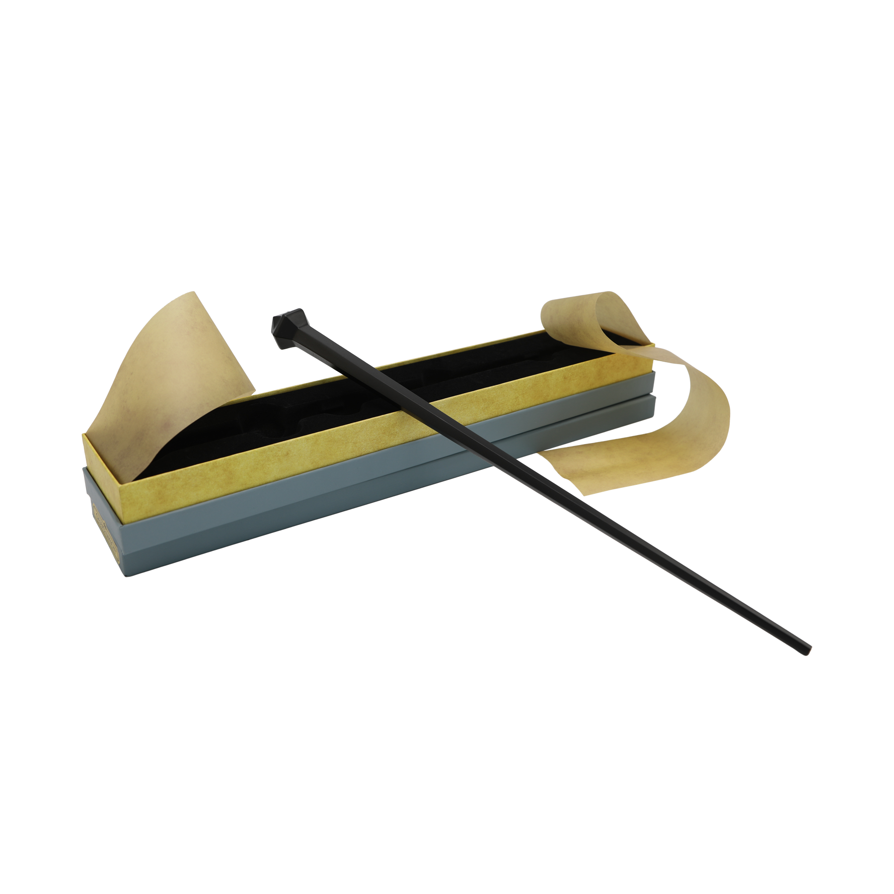 Credence Barebone's Wand measures approximately 14 inches in length. Presented in a sleek, collectible box featuring the character name and decorative paper overlay, the wand comes ready to display anywhere in your home. This authentic replica is a fragile collectible sculpted in resin and not intended for use as a toy.